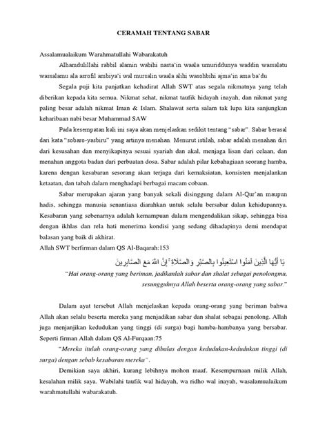 Kesabaran adalah sebuah kebajikan mulia yang seringkali sulit diwujudkan, namun sangat penting untuk menjalani hidup yang damai dan bahagia. Dalam ceramah singkat ini, kita akan membahas tentang makna kesabaran, manfaatnya, dan cara mengembangkan sikap sabar dalam hidup kita.